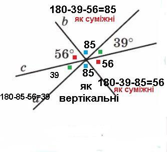 становлять розгорнутий кут ; тому ∠(а,b) = 180° - ( 56° + 39° ) =