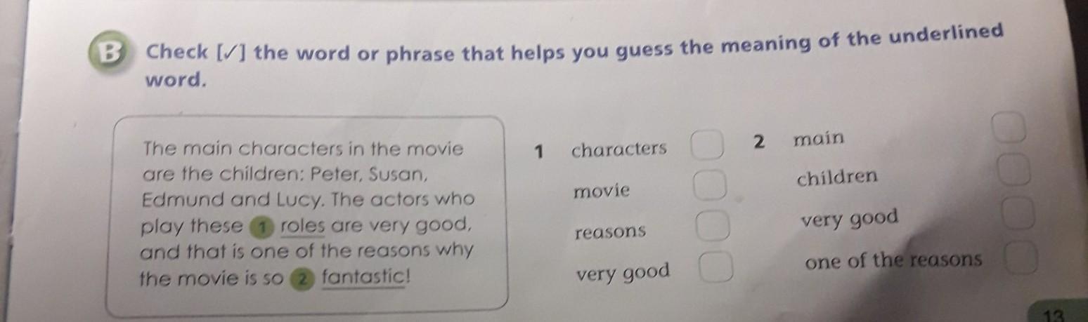B Check [✔] the word or phrase that helps you guess the meaning of the underlined word. помогите пожалуйста