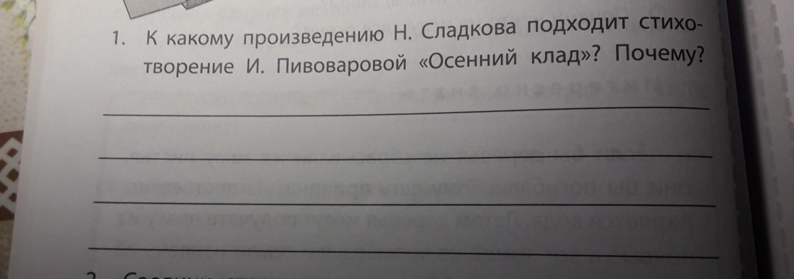 1. К какому произведению Н. Сладкова подходит стихо- творение И. Пивоваровой «Осенний клад»? Почему? помогите пожалуйста