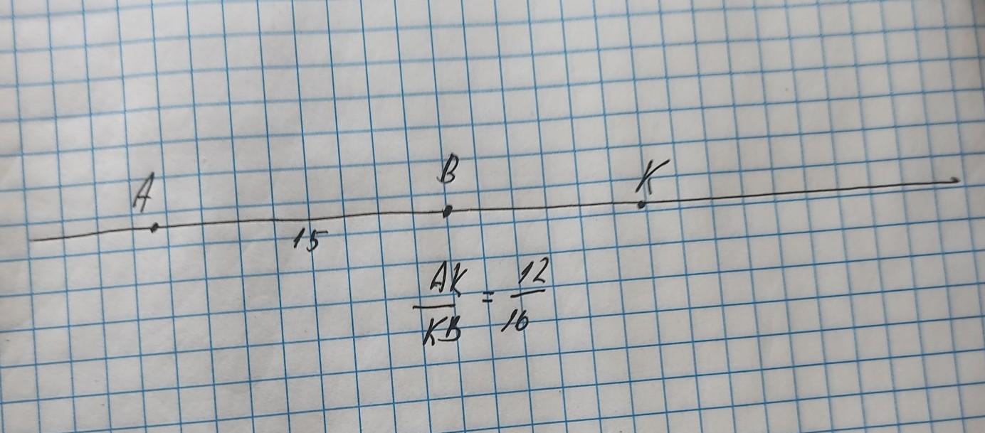Даю 100 баллов: Точка K лежит на прямой AB, но вне отрезка AB так, что AK:KB = 1,2. Найдите длину отрезка AK, если AB= 15 м.