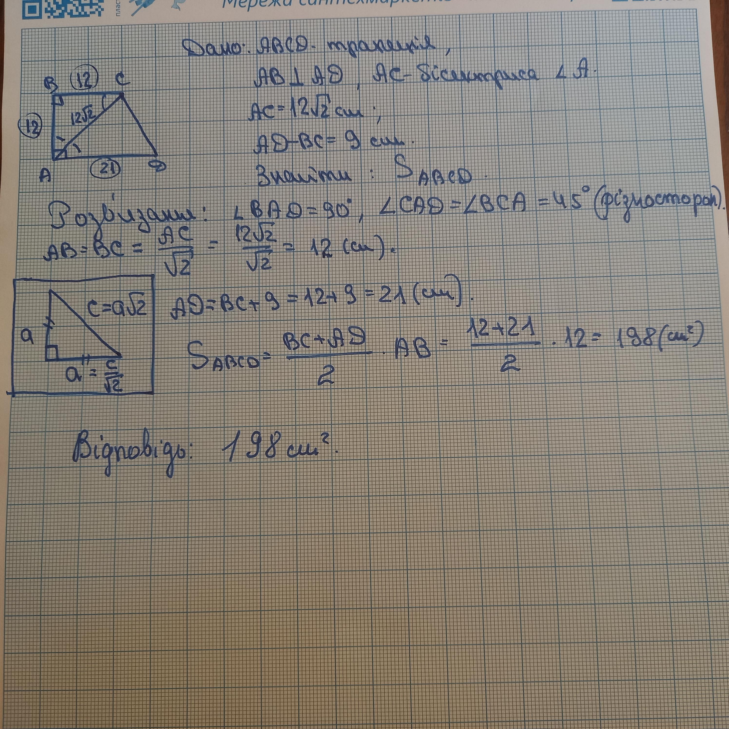 Менша діагональ прямокутної трапеції, довжина якої 12√2 см, с бісектрисою прямого кута. Обчислити площу трапеції, якщо різниця її основ дорівнює 9 см.