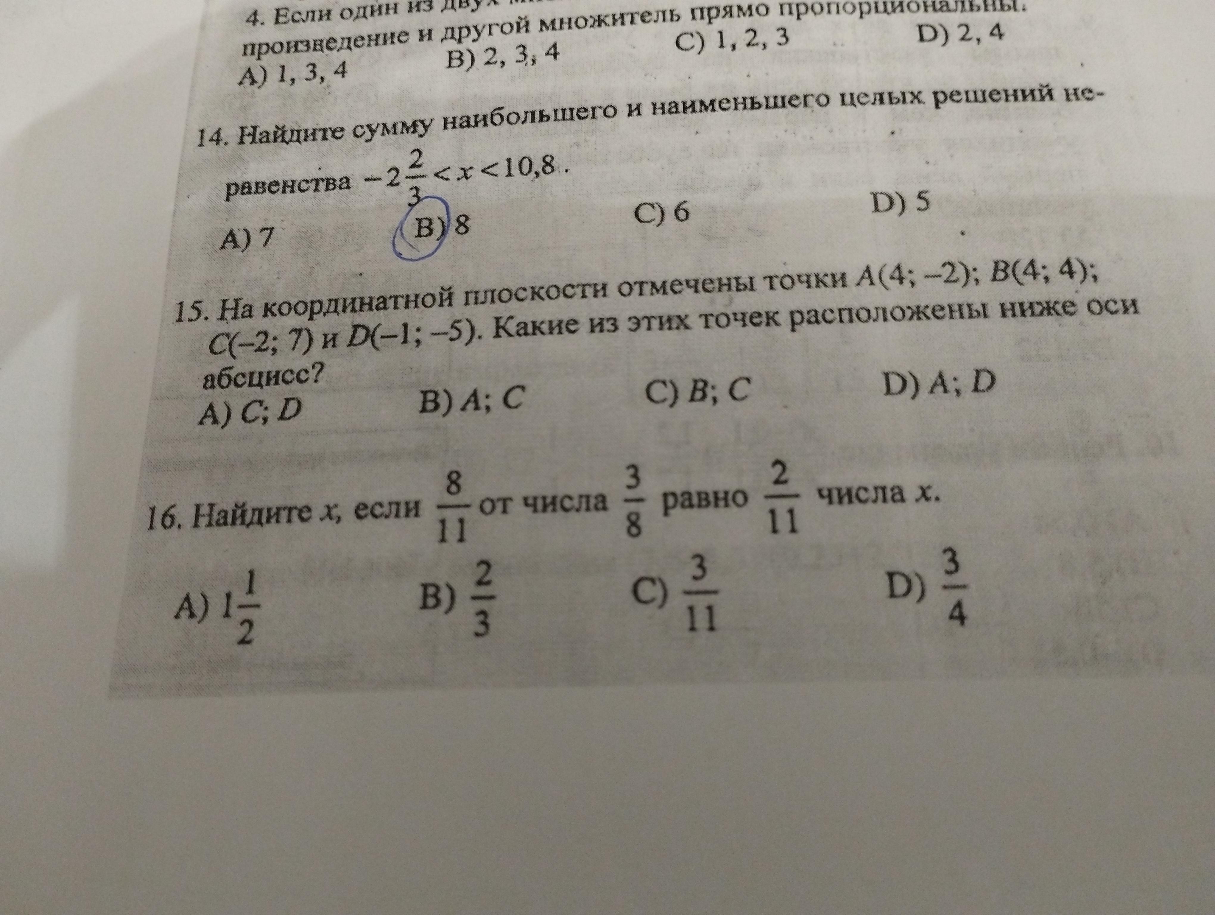 15. На координатной плоскости отмечены точки A(4; -2); B(4; 4); C(-2; 7) и D(-1; -5). Какие из этих точек расположены ниже оси абсцисс?