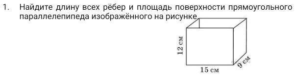 площадь поверхности: площадь боковых ( их всего 4 и их площадь находится 12*15*4=720)+площадь оснований ( их 2 вкрхнее и нижнее и наодится как 9*15*2=270)=990 см^2 плошадь всей поверхности параллелепипеда