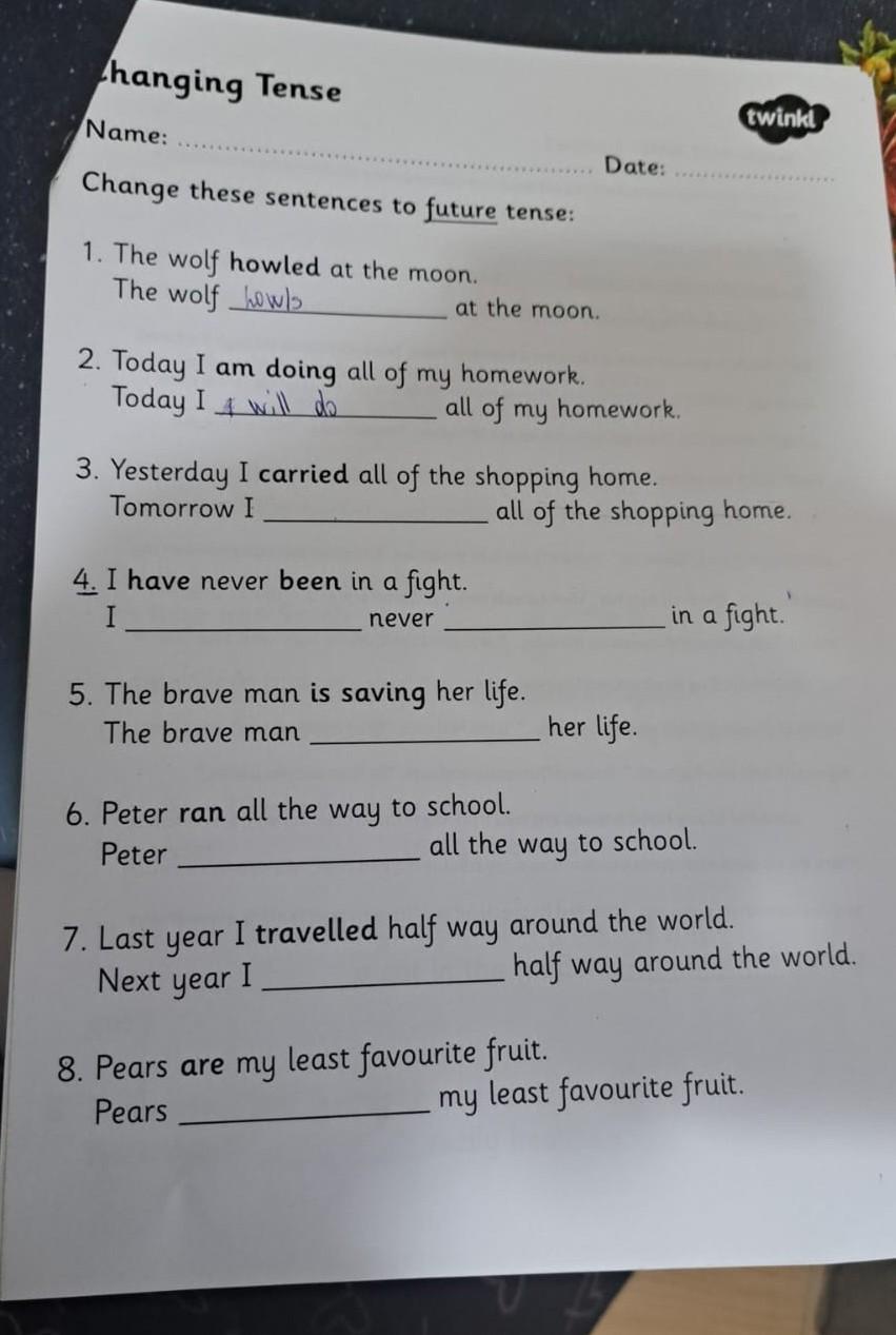 hanging Tense Name: Change these sentences to future tense: 1. The wolf howled at the moon. The wolf howls at the moon. 2. Today I am doing all of my homework. Today I will do all of my homework. 3. Yesterday I carried all of the shopping home. Tomorrow I 4. I have never been in a fight. I never Date: 5. The brave man is saving her life. The brave man all of the shopping home. 6. Peter ran all the way to school. Peter her life. all the way to school. 7. Last year I travelled half way around the world. Next year I 8. Pears are my least favourite fruit. Pears twinkl in a fight. 1 half way around the wor my least favourite fruit.