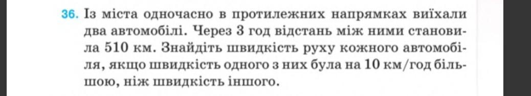 36. Із міста одночасно в протилежних напрямках виїхали два автомобілі. Через 3 год відстань між ними станови- ла 510 км. Знайдіть швидкість руху кожного автомобі- ля, якщо швидкість одного з них була на 10 км/год біль- шою, ніж швидкість іншого.