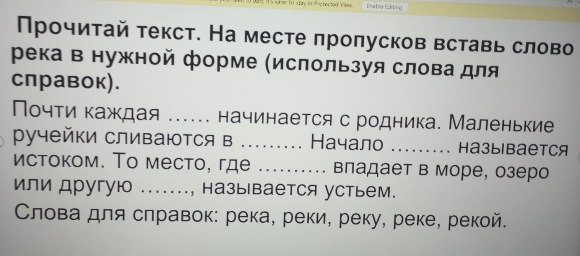 Почти каждая река начинается с родника. Маленькие ручейки сливаются в реки. Начало реки называется истоком. То место, где река впадает в море, озеро или другую реку, называется устьем.