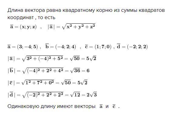 Среди векторов a=[3;-4;5],b=[-4;2;4],c=[1;7;0],d=[-2;2;2] найдите такие которые имеют одинаковую длину
