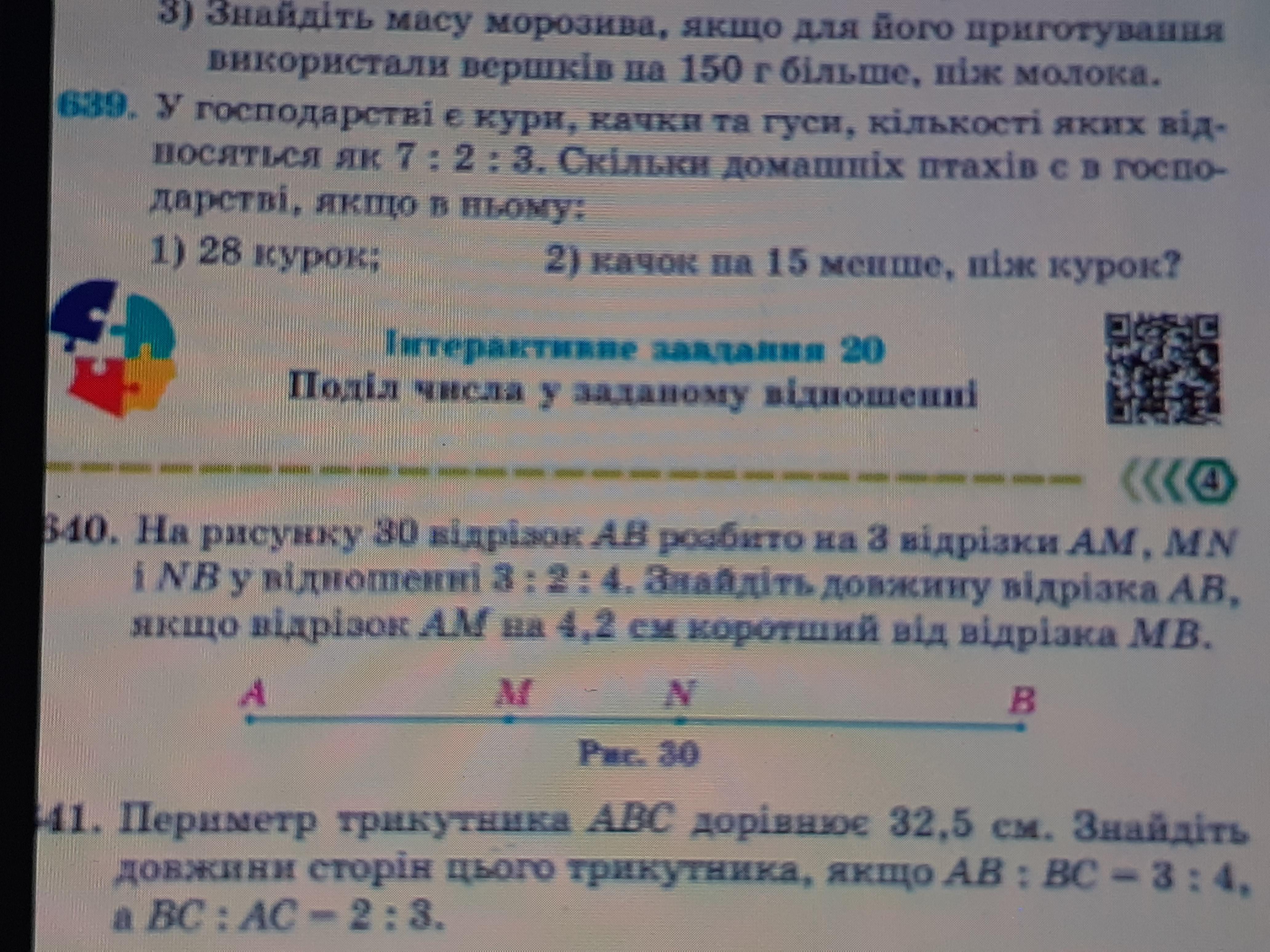 На рисунку 30 відрізок АВ розбито на 3 відрізки АМ, МN, і NB у відношенні 3:2:4. Знайдіть довжину відрізка АВ, якщо відрізок АМ, на 4,2 см коротший від відрізка МВ.