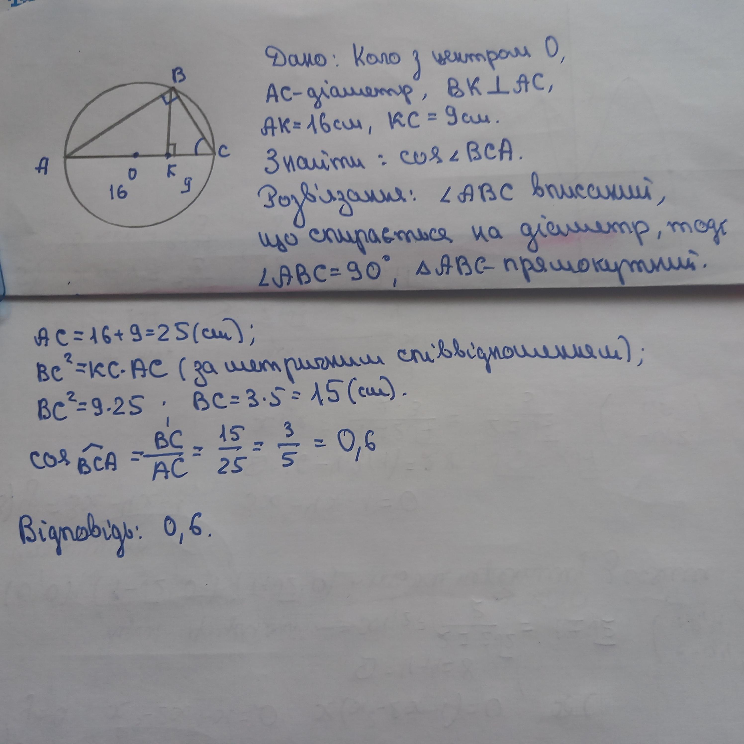 Із точки В, яка лежить на колі, опущено перпендикуляр ВК на його діаметр АС. Знайдіть косинус кута ВСА, якщо АК = 16 см, КС = 9 см