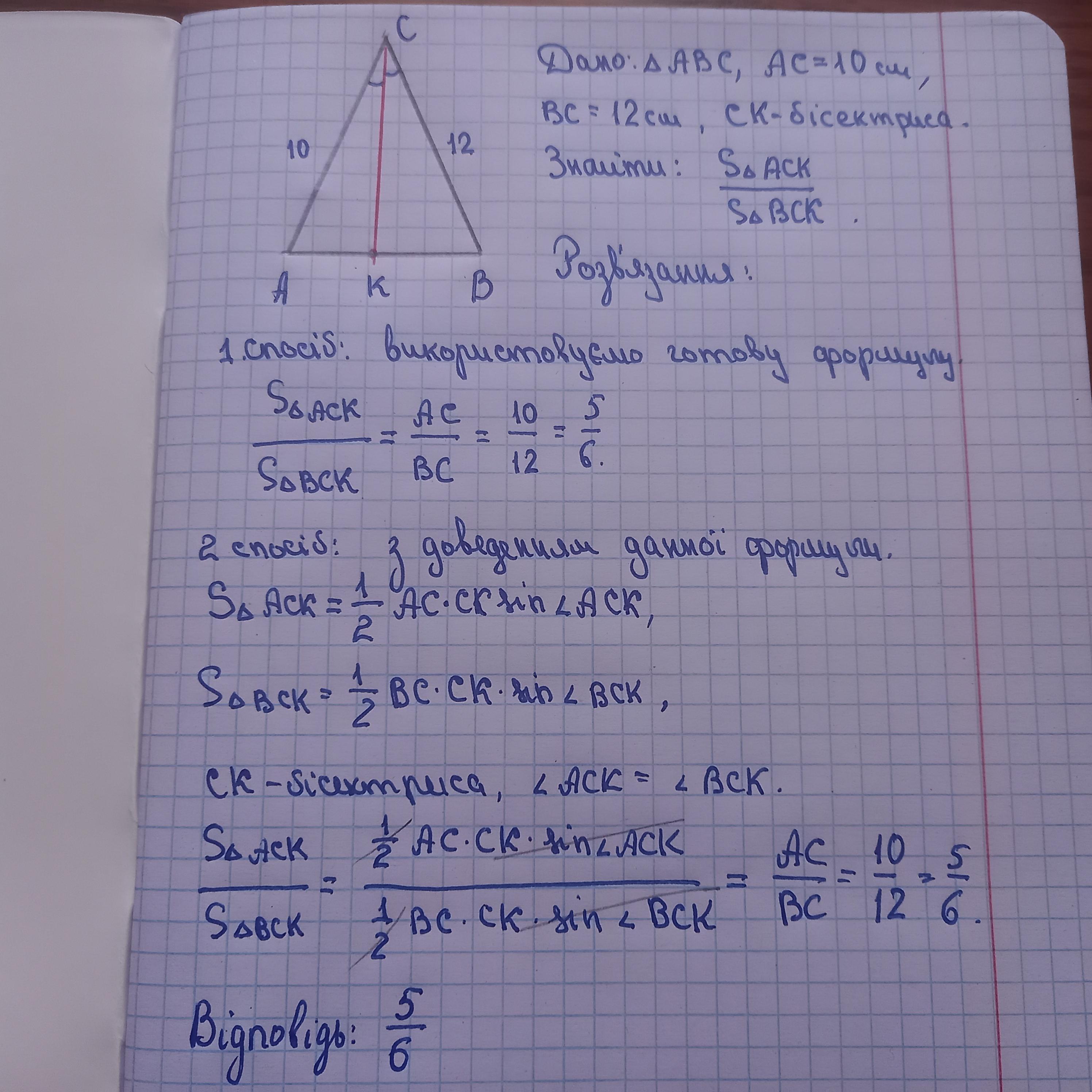 У трикутнику АВС відомо, що АС = 10 см, ВС = 12 см, відрізок СК - бісектриса трикутника. Знайдіть відношення площ трикутників АСК і ВСК.