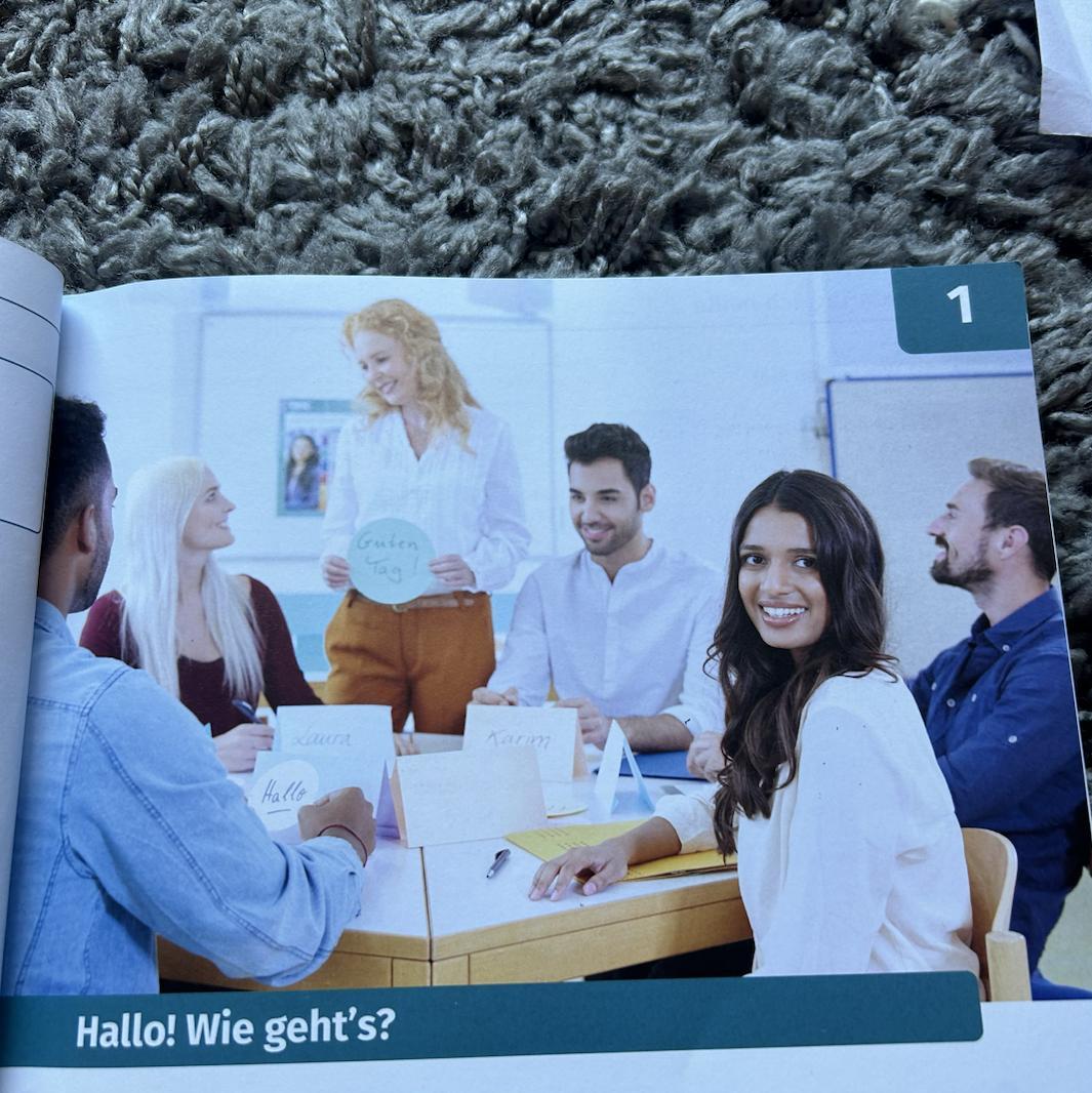 Die Bilder zeigen die Klasse, die die Projekt-/Gruppenarbeit durchführt, und Sie können auch den Lehrer sehen, der ihnen dabei hilft. Auch auf den Bildern ist zu sehen, wie sie die Begrüßungsform auf Deutsch lernen. Wahrscheinlich lernen sie die deutsche Sprache, daher können wir folgende Schlussfolgerung ziehen: Gymnasiasten lernen die deutsche Sprache, und der Lehrer hilft ihnen auch dabei, ihre Sprachkenntnisse zu verbessern und Sie weiterzuentwickeln