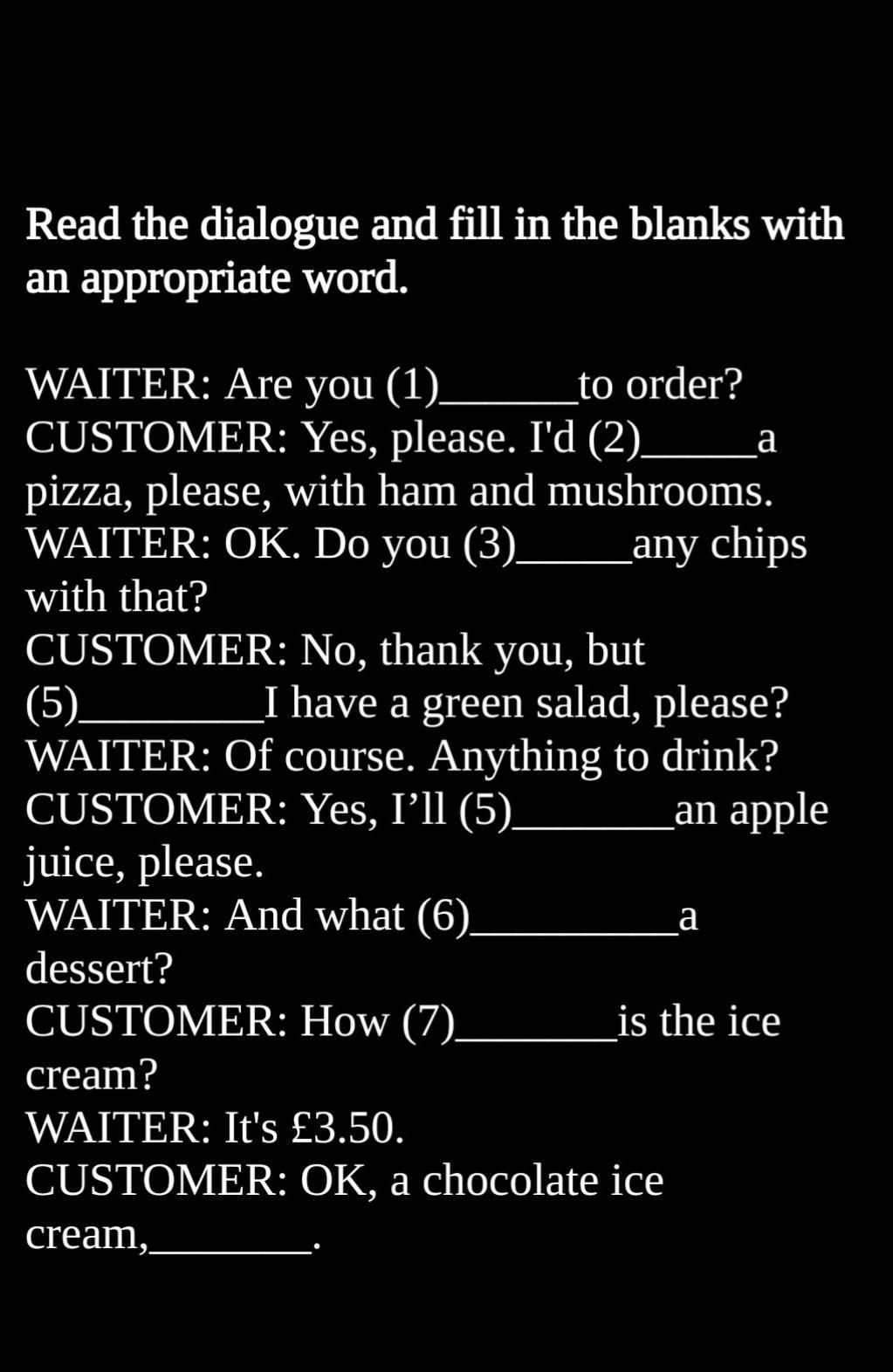 CUSTOMER: Yes, please. I'd like a pizza, please, with ham and mushrooms.