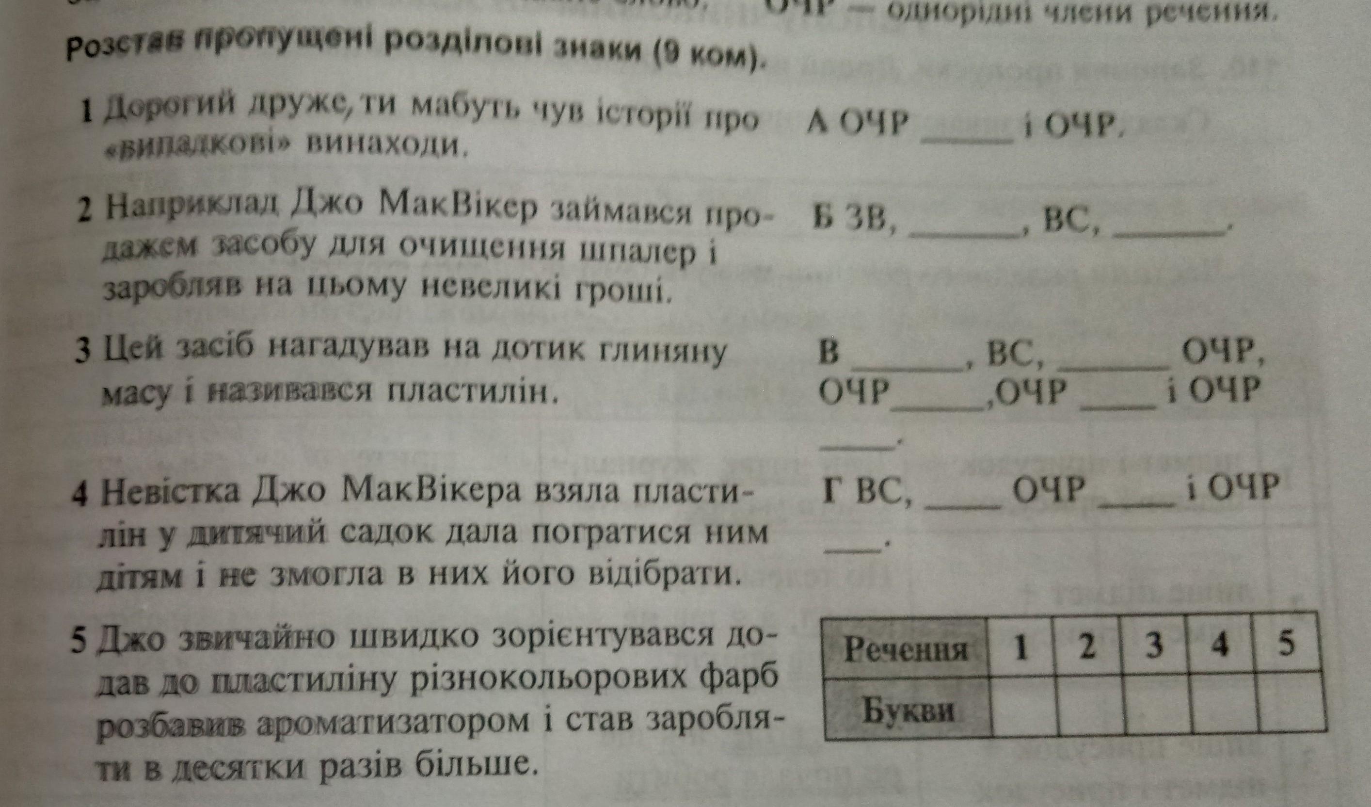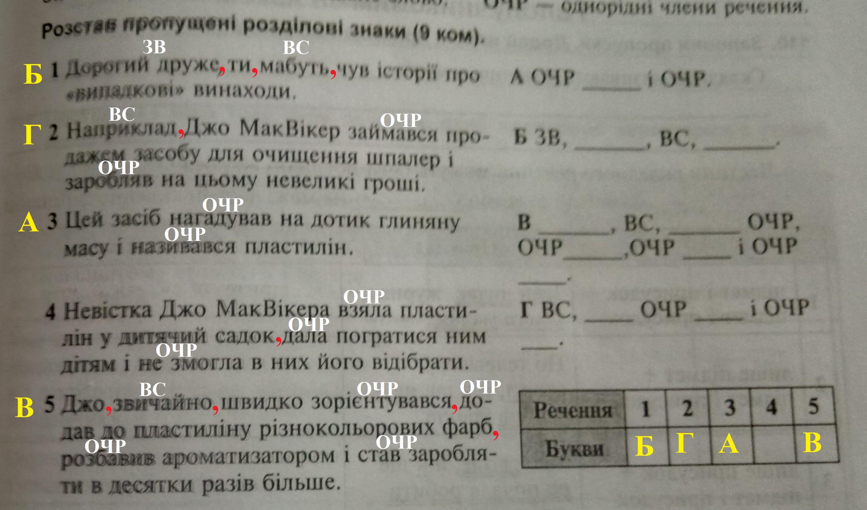 Поеднай речення з відповідною їм пунктуаційною схемою. 3B - звертання. ВС - вставне слово. Розстав пропущені розділові знаки (9 ком). 1 Дорогий друже, ти мабуть чув історії про «випадкові>> винаходи 3 Цей засіб нагадував на дотик глиняну масу і називався пластилін. 2 Наприклад Джо МакВікер займався про- Б 3В, дажем засобу для очищення шпалер і заробляв на цьому невеликі гроші. 4 Невiстка Джо МакВікера взяла пласти- лiн у дитячий садок дала погратися ним дітям i не змогла в них його відібрати. ОЧР - однорідні члени речення. 5 Джо звичайно швидко зорієнтувався до дав до пластиліну рiзнокольорових фарб розбавив ароматизатором і с ти в десятки разів більше.