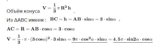 В прямоугольном треугольнике АВС гипотенуза АВ равна 3, угол А равен а. Треугольник АВС вращается вокруг катета ВС. Найдите объем полученного тела вращения