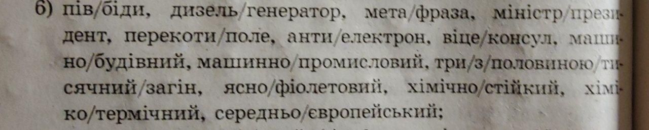 півбіди, дизель-генератор, метафаза, міністр-прещидент, перекоти-поле, антиелектрон, віце-консул, машино-будівний, машино-промисловий, три з половиною, тисяний загін, ясно фіолетовий, хімічно-стійкий, хімічко термічний, середньоєвропейський.