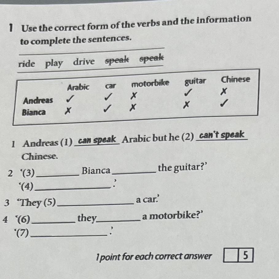 2. Can Bianca play the guitar? No, she can't. 3. They can drive a car. 4. Can they ride a motorbike? No, they can't.