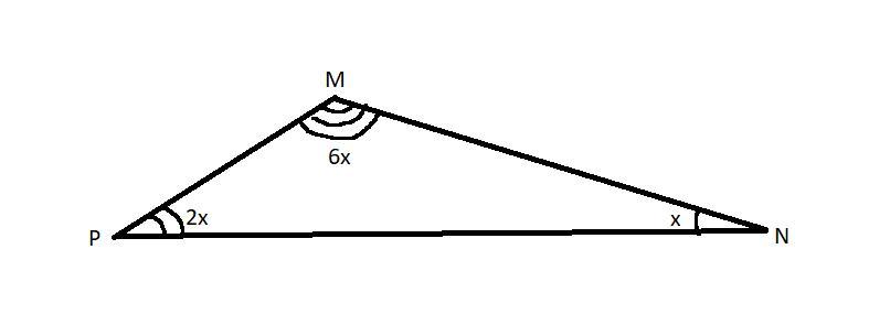 Пусть ∠N будет равен x°, тогда ∠P будет равен 2x°, а ∠М 6х°. По определению треугольника мы знаем, что сумма всех его углов равна 180°