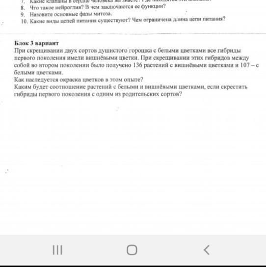 Вишневый цвет является доминантным признаком, а белый — рецессивным. При скрещивании двух сортов с белыми цветками все гибриды первого поколения имели вишневые цветки, потому что они получили от каждого родителя один ген вишневого цвета (обозначим его как R) и один ген белого цвета (обозначим его как r). Таким образом, их генотип был Rr, а фенотип — вишневый. При скрещивании этих гибридов между собой во втором поколении было получено 136 растений с вишневыми цветками и 107 - с белыми цветками. Это соответствует примерному соотношению 3:1, которое можно объяснить следующим образом: из четырех возможных комбинаций генов Rr x Rr три будут давать вишневый цвет (RR, Rr и rR), а одна — белый (rr).