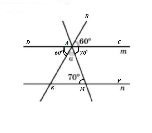 180° = 60° + α + 70° ⇒ α = 180° - 60° - 70° , α = 50°