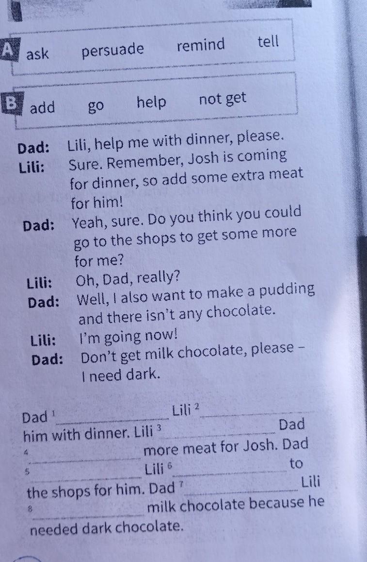 6 to kets. A B ask add Dad: Lili: 53 Lili: Dad: persuade Dad: Yeah, sure. Do you think you could go to the shops to get some more for me? Lili: Dad: go help not get Lili, help me with dinner, please. Sure. Remember, Josh is coming for dinner, so add some extra meat for him! Dad ¹ him with dinner. Lili ³ remind tell Oh, Dad, really? Well, I also want to make a pudding and there isn't any chocolate. I'm going now! Don't get milk chocolate, please - I need dark. Dad more meat for Josh. Dad Lili to the shops for him. Dad? 8 milk chocolate because he needed dark chocolate.