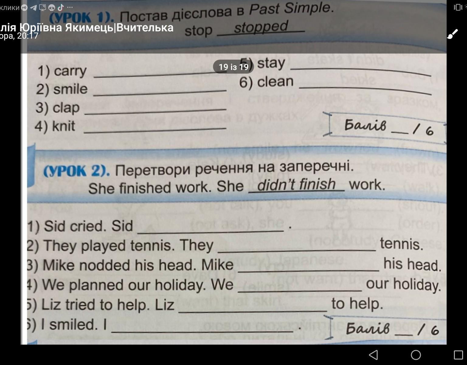 1. Sid didn't cry. 2. They didn't play tennis. 3. Mike didn't nod his head. 4. We didn't plan our holiday. 5. Liz didn't try to help. 6. I didn't smile.
