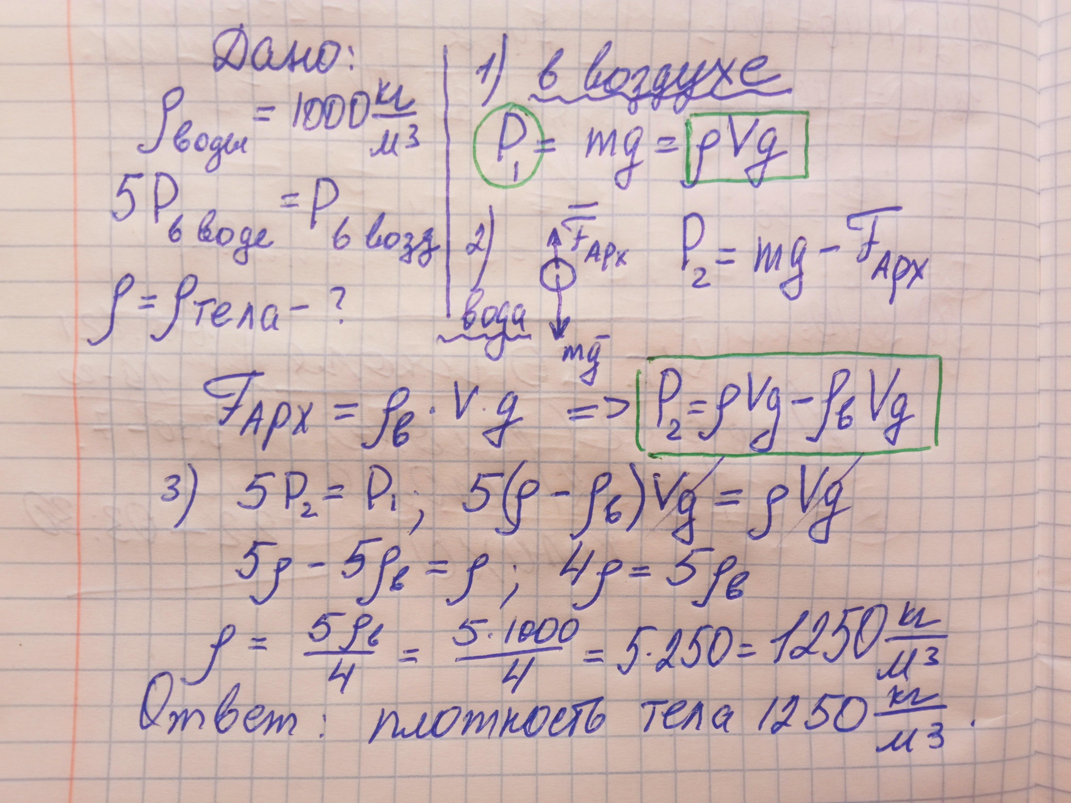 Если тело полностью погрузить в воду, его вес будет в 5 раз меньше, чем в воздухе, какова плотность тела? р=1000кг/м³