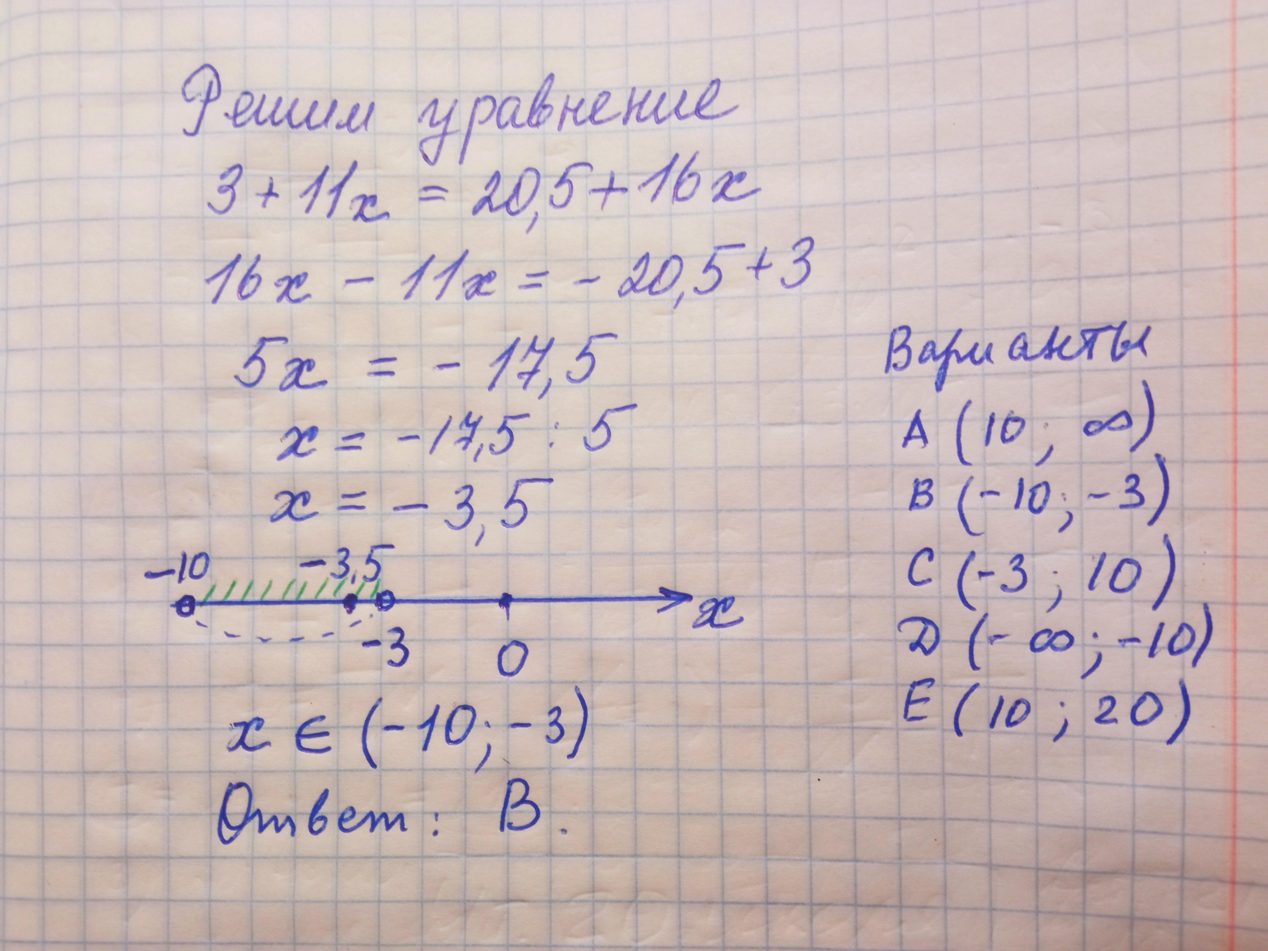 В каком промежутке находится корень уравнения 3+11х=20,5+16х