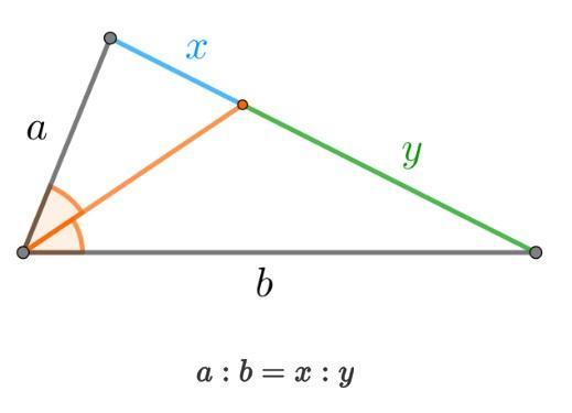 Биссектриса треугольника делит противоположную сторону треугольника на два отрезка, длины которых пропорциональны соответствующим прилежащим сторонам треугольника. (наглядно смотри на прикрепленном файле 1)