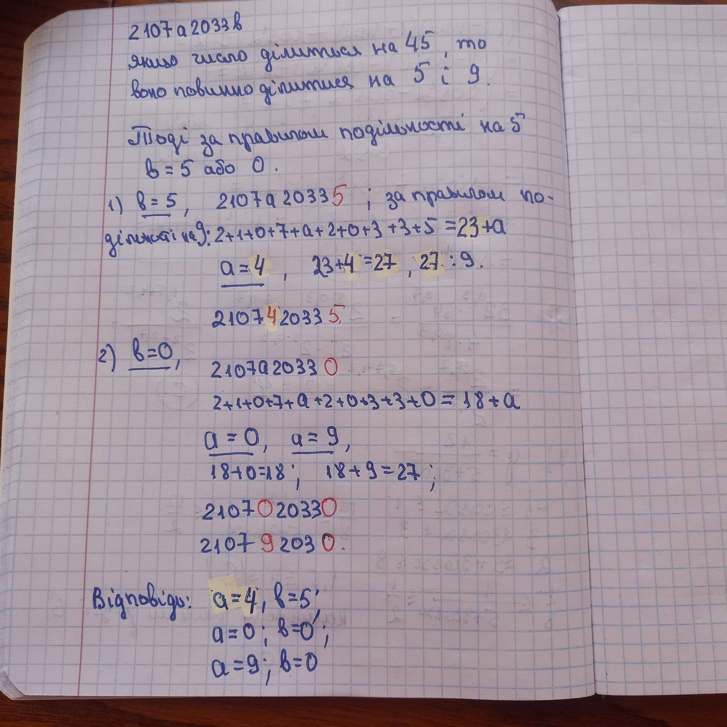 Знайдіть цифри а та б такі , для яких число 2107а2033b ділиться на 45
