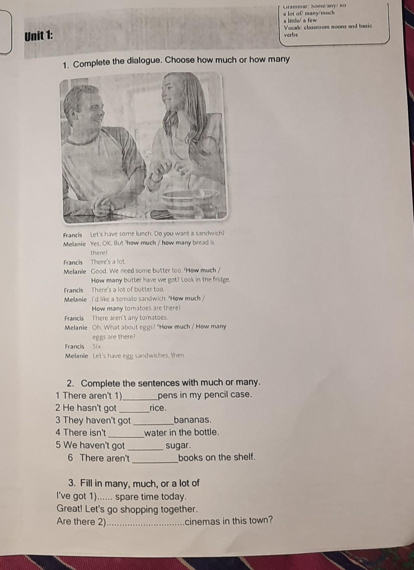 упр1. 1. how much bread is there? 2. How much butter have we got? 3. How many tomatoes are there? 4. How many eggs are there? Ex2. 1. many 2. much 3. many 4. much 5. much 6. There aren't many books on the shelf.