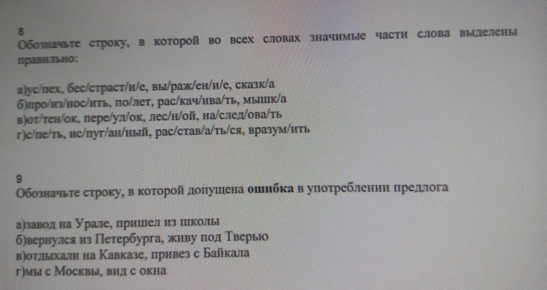 8. Обозначьте строку, в которой все значимые части слова выделены правильно.