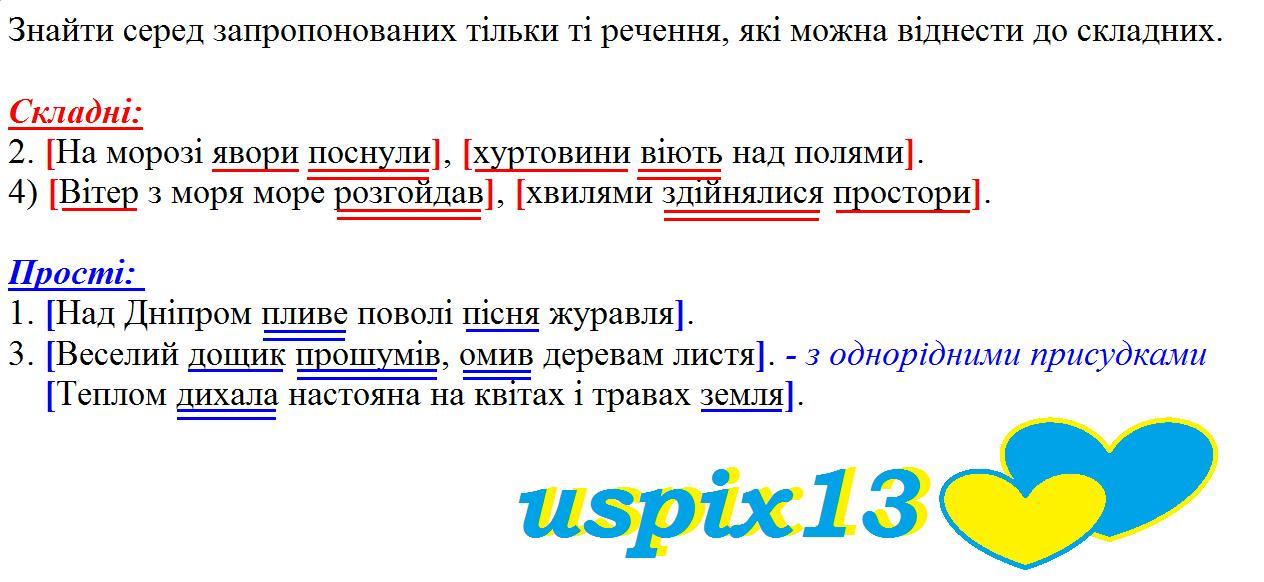 Знайти серед запропонованих тільки ті речення, які можна віднести до складних. Просте 1 Над Дніпром пливе поволі пісня журавля. Прост 2. На морозi явори поснули, хуртовини віють над полями.3. Веселий дощик прошумів, омив деревам листя. 4) Вітер з моря море розгойдав, хвилями здійнялися простори. Теплом дихала настояна на квітах і травах земля.