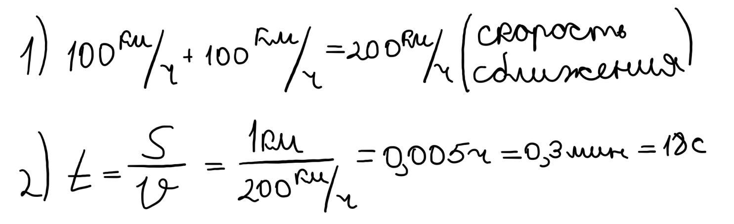 Туча едет со скоростью 100 км/ч мы к ней навстречу едем со скоростью 100 км/ч, туча длиной 1 км. Сколько по времени мы будем под дождём?