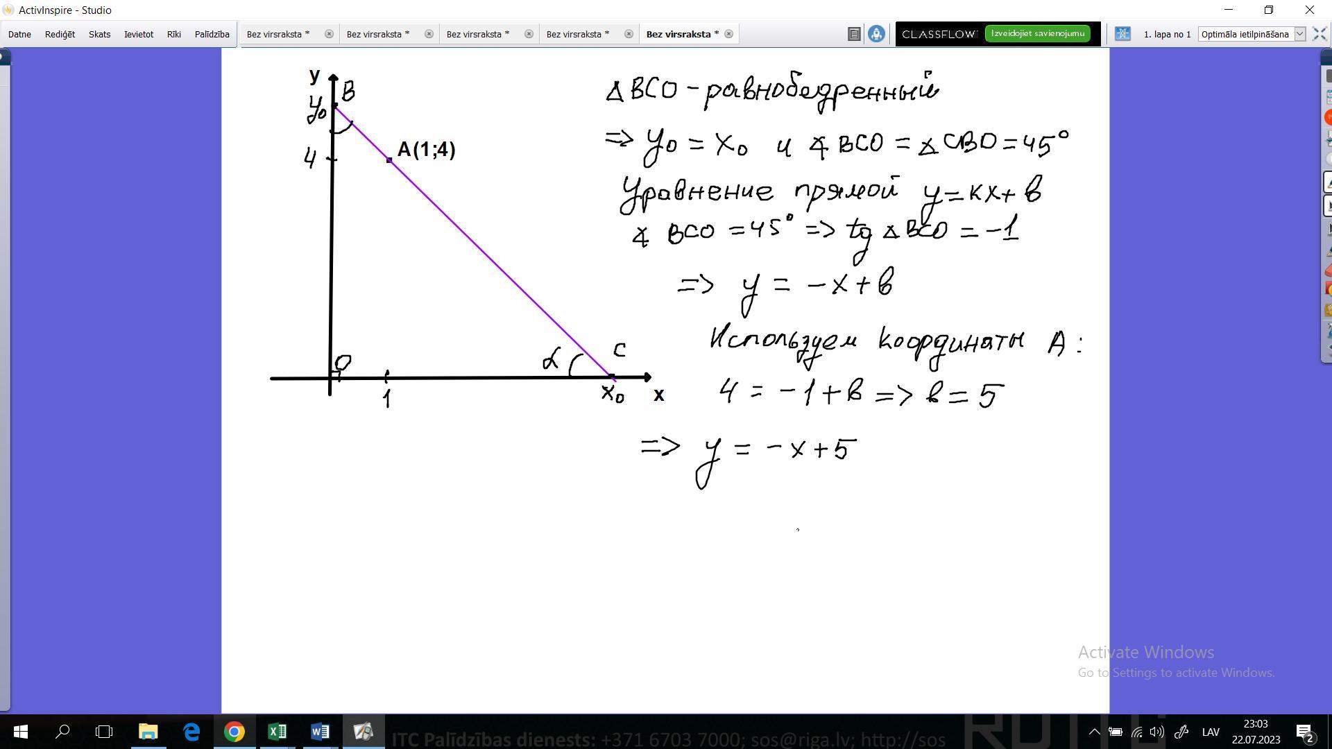 Вы площадь забыли найти , прямая отсекает от осей равные отрезки , поэтому её уравнение x + y = a и а = 1 + 4 ( альтернативное решение )