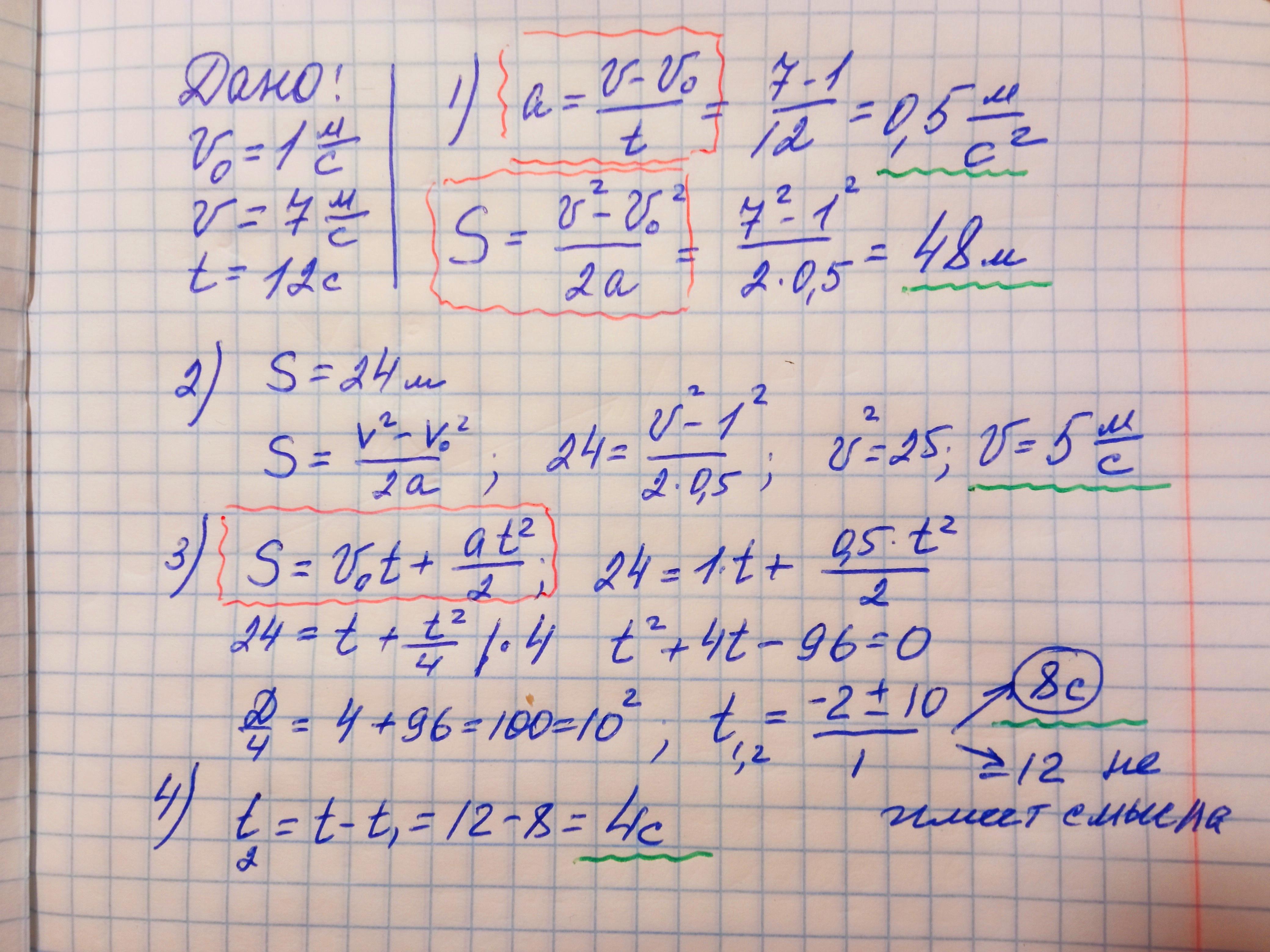 Тело, имея начальную скорость Vo = 1 м/с, двигалось равноускоренно и, пройдя некоторое расстояние S, приобрело скорость V = 7 м/с. Время разгона составило t0= 12 с.