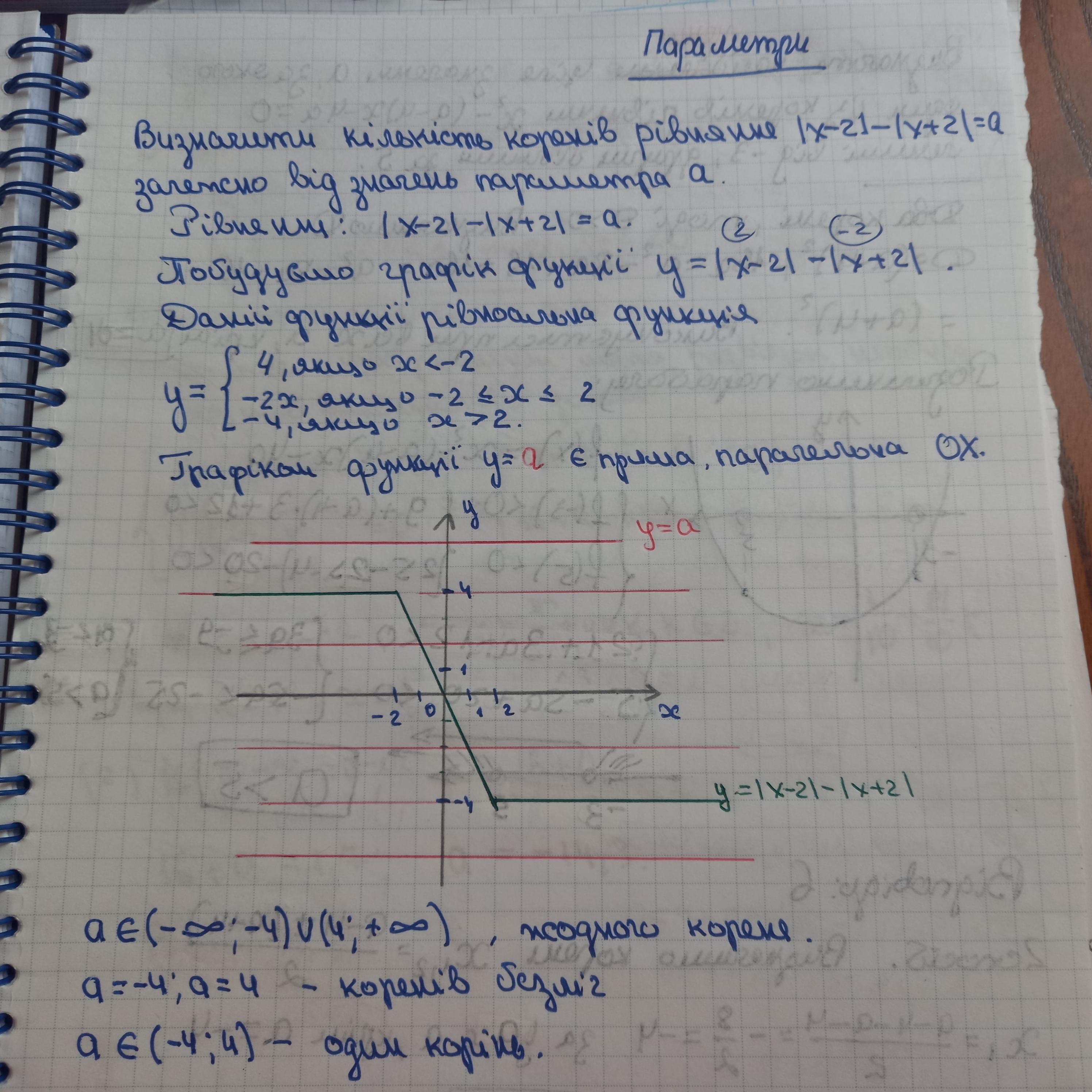 Визначте кількість коренів рівняння |x - 2| - |x + 2| = a залежно від значень параметра а.