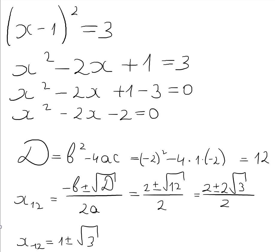 1. Раскрываешь квадратные скобки: (x-1)(x-1) = x^2 – 2x + 1 = 3