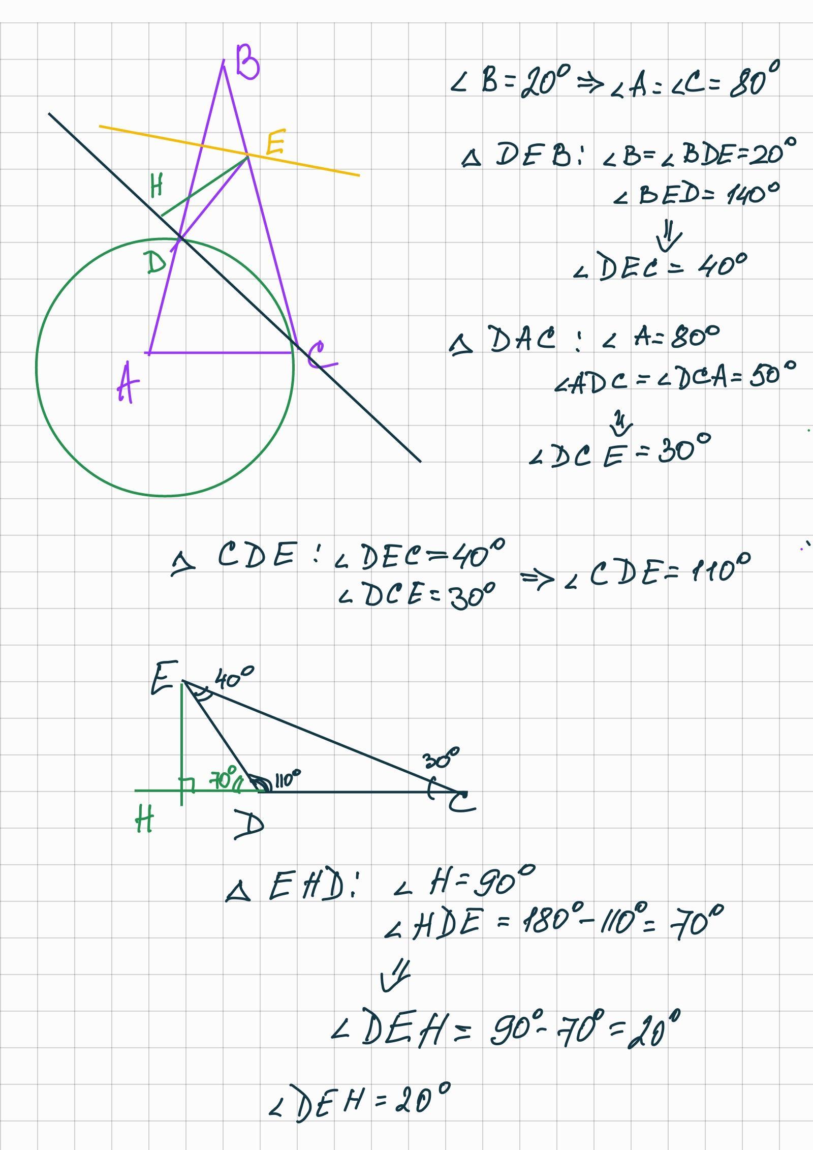 В треугольнике ABC угол АВС = 20° , АВ = ВС. На стороне АВ отмечена точка D, так что АD = AC, а на стороне BC отмечена точка E, так что BE = ED. Из точки E на CD опущен перпендикуляр EH. Найти угол DEH