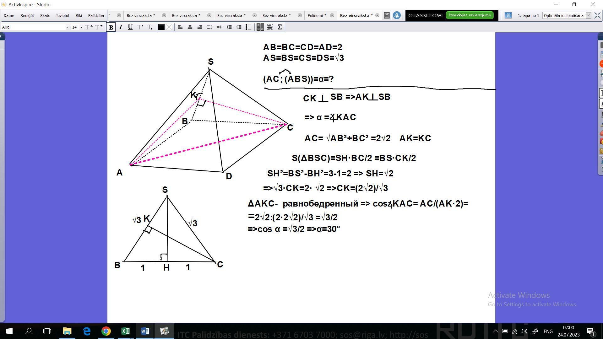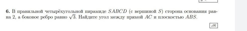 Да . Спасибо . Теперь вижу. СК перпендикулярна SB, но не перпендикулярна плоскости (ABS) . Но требуемый угол по-моему все равно КАС. Если будем проектировать центр диагонали основания O, то он на самом деле спроектируется на апофему ASB, а точнее в точку H пересечения высот треугольника ASB. Следовательно проекция АО на (ABS) это АН. АН- это часть АК. Как Вы думаете теперь удовлетворительное обьяснение ?