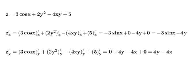 zₓ' = ( 3cosx + 2y² - 4xy + 5 )ₓ' = 3 *(- sinx ) + 0 - 4 * 1 * y + 0 = -3sinx - 4y;