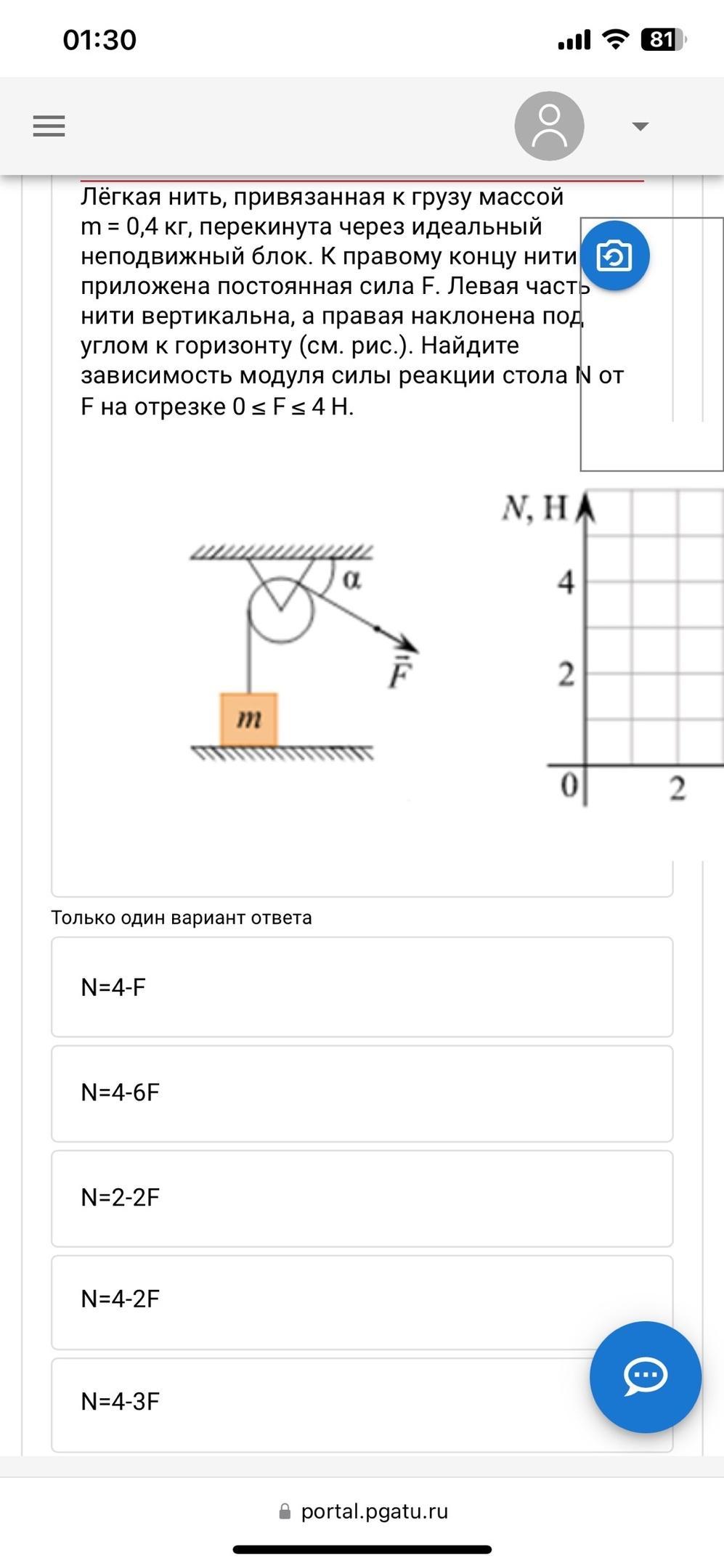 когда груз не поднимают F = 0 , реакция опоры максимальна N = m*g = 4 H