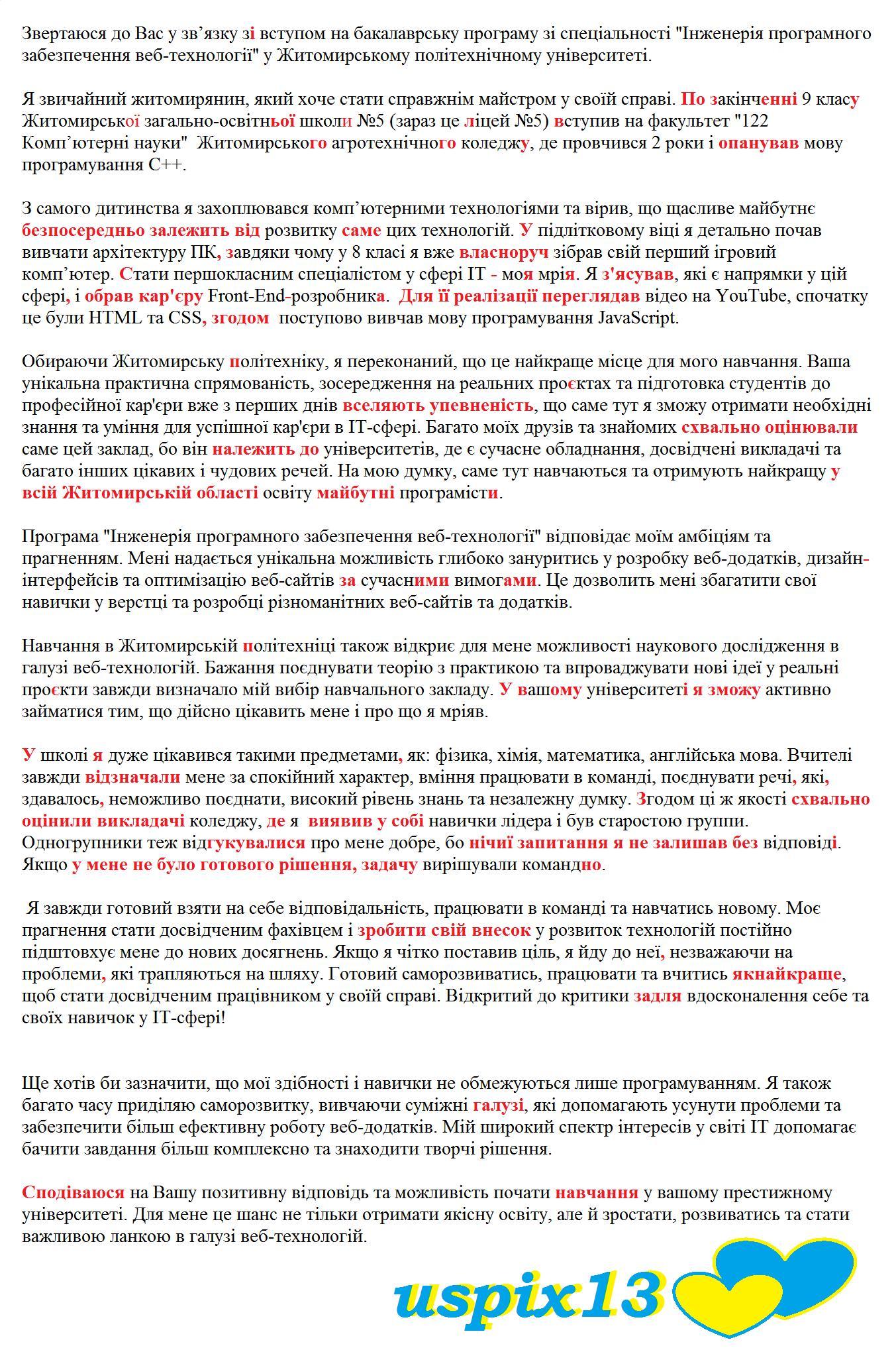 Звертаюся до Вас у зв’язку з вступом на бакалаврську програму зі спеціальності "Інженерія програмного забезпечення веб-технології" у Житомирському політехнічному університеті.