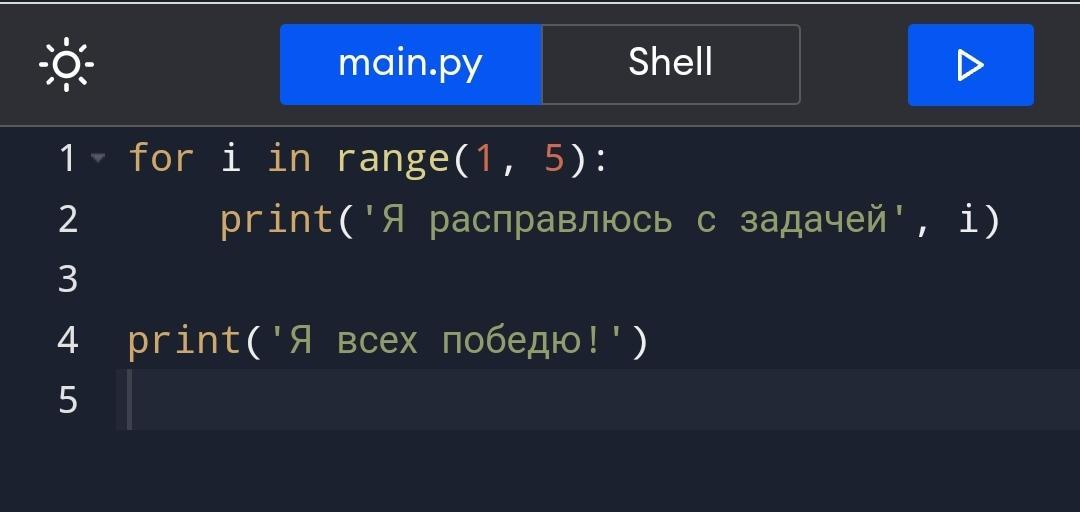 Диапазон чисел в range() указывается двумя числами через запятую: range(от, до). Последнее число в диапазон не включается.