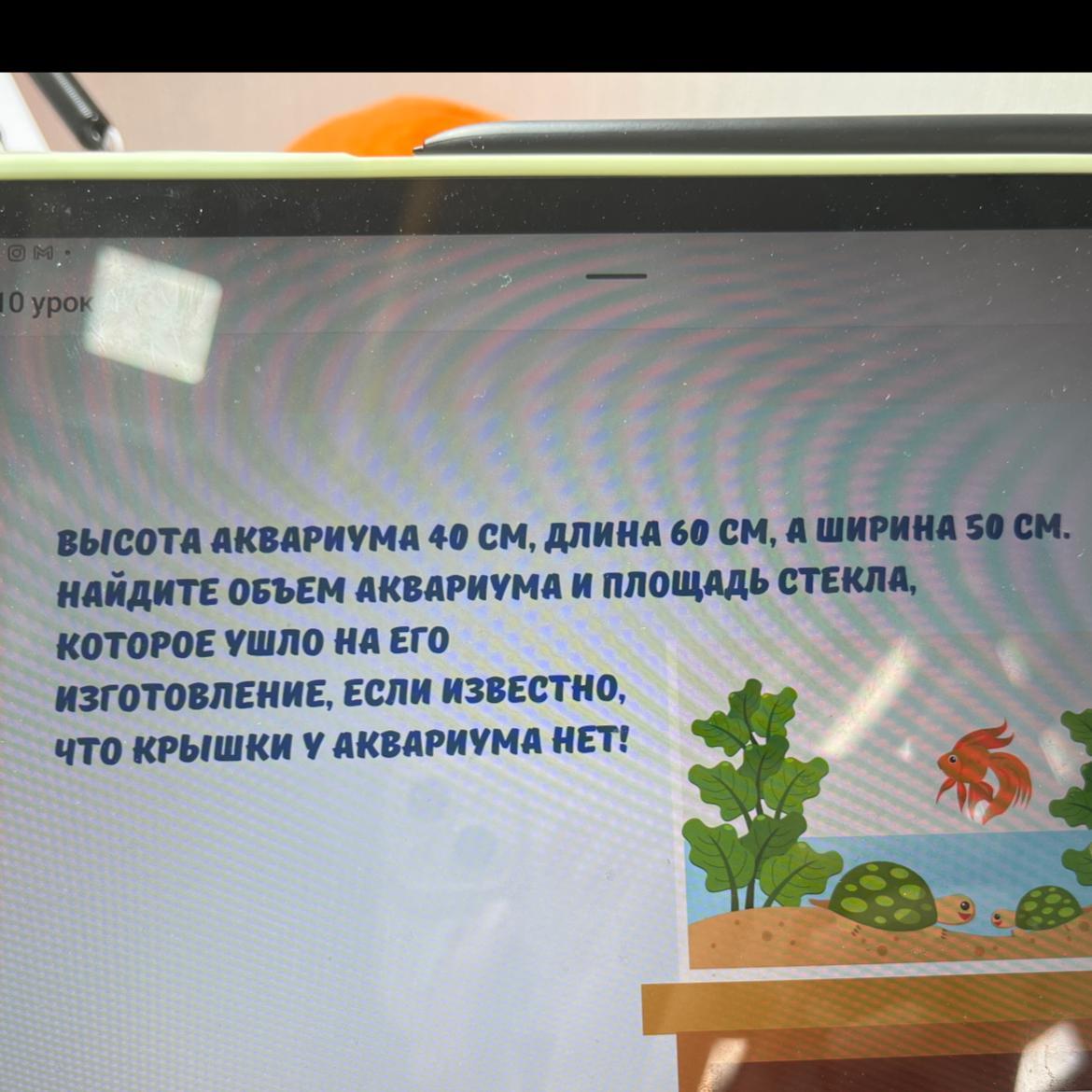 Ответ: объем аквариума равен 120000 см³, площадь стекла равна 11800 см².