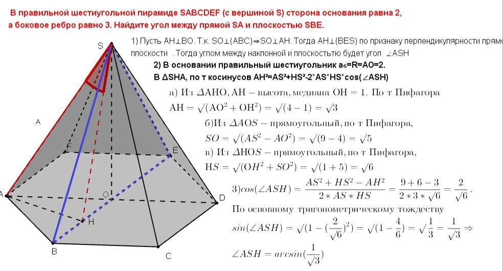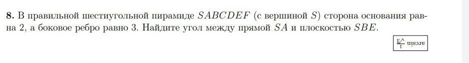 В правильной шестиугольной пирамиде SABCDEF (с вершиной S) сторона основания равна 2, а боковое ребро равно 3. Найдите угол между прямой SA и плоскостью ЅВЕ.