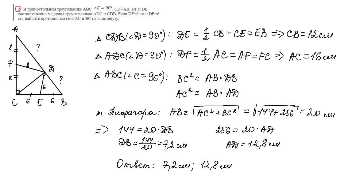 АС=2DF=16; BC=2DE=12. По Пифагору АВ=20. АС^2=AD*AB. AD=12,8; DB=7,2
