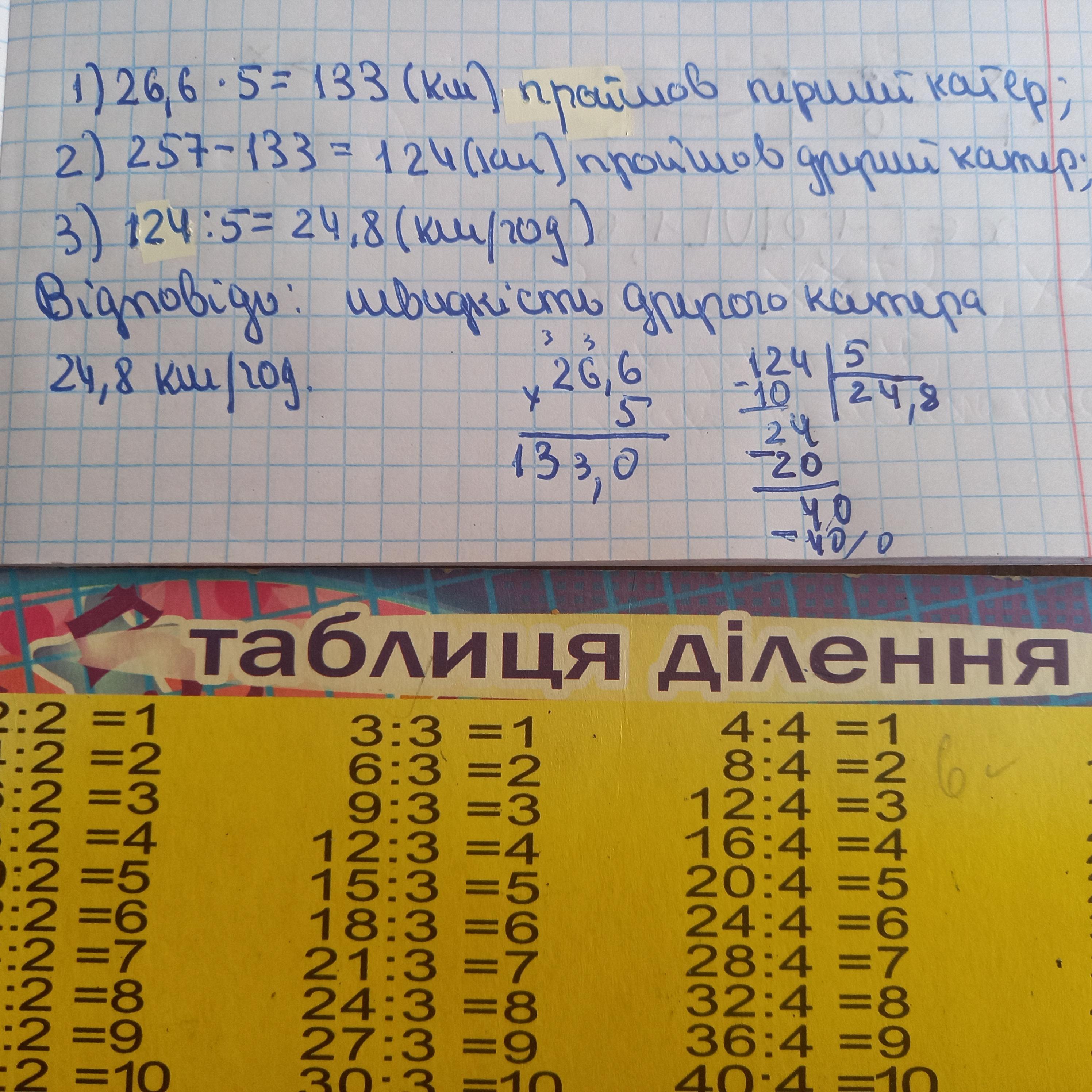 8. Вiд однієї пристані одночасно в протилежних напрямках вируши- ли два катери. Через 5 год після початку руху відстань між ними становила 257 км. Відомо, що пер- ший катер рухався зі швидкістю 26,6 км/год. З якою швидкістю рухався другий катер?