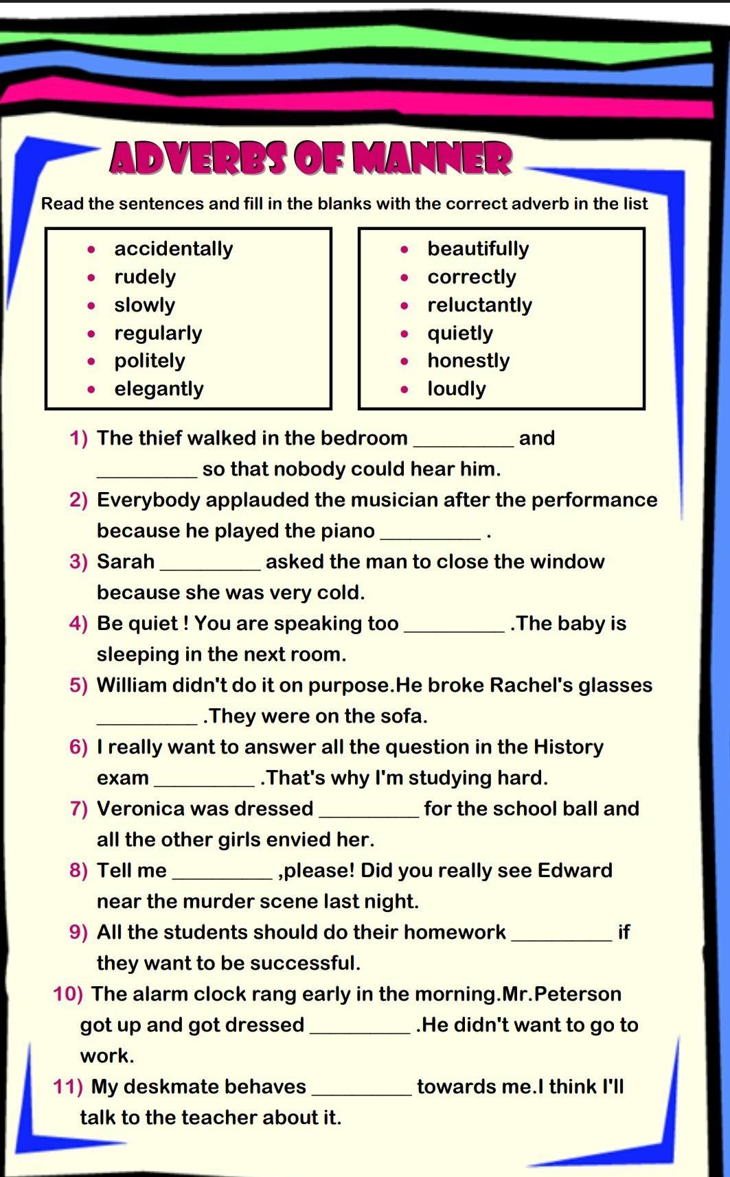 ADVERBS OF MANNER Read the sentences and fill in the blanks with the correct adverb in the list ● accidentally • rudely • slowly • regularly • politely ● elegantly ● 3) Sarah • correctly • reluctantly • quietly ● honestly loudly ● 1) The thief walked in the bedroom beautifully and so that nobody could hear him. 2) Everybody applauded the musician after the performance because he played the piano asked the man to close the window because she was very cold. 4) Be quiet! You are speaking too sleeping in the next room. 5) William didn't do it on purpose. He broke Rachel's glasses .They were on the sofa. 6) I really want to answer all the question in the History exam ..That's why I'm studying hard. 7) Veronica was dressed all the other girls envied her. 8) Tell me near the murder scene last night. 9) All the students should do their homework they want to be successful. 10) The alarm clock rang early in the morning. Mr. Peterson .He didn't want to go to got up and got dressed work. 11) My deskmate behaves talk to the teacher about it. .The baby is for the school ball and ,please! Did you really see Edward towards me. I think I'll
