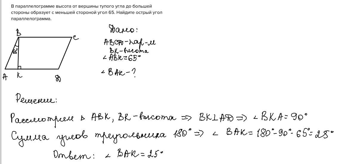 В параллелограмме высота от вершины тупого угла до большей стороны образует с меньшей стороной угол 65. Найдите острый угол параллелограмма.