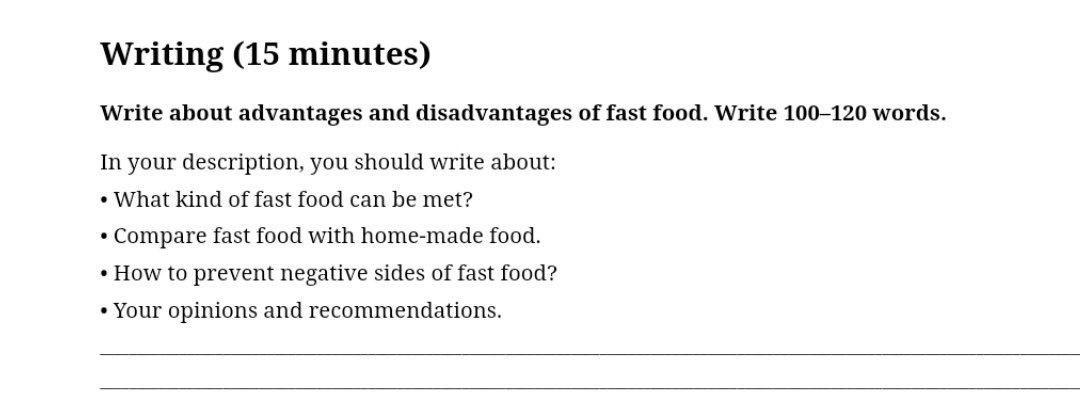 Write about advantages and disadvantages of fast food. Write 100-120 words.